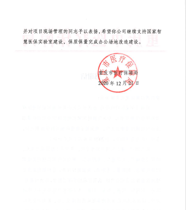 國(guó)家智慧醫(yī)保實(shí)驗(yàn)裝飾裝修工程獲重慶市醫(yī)保局感謝信