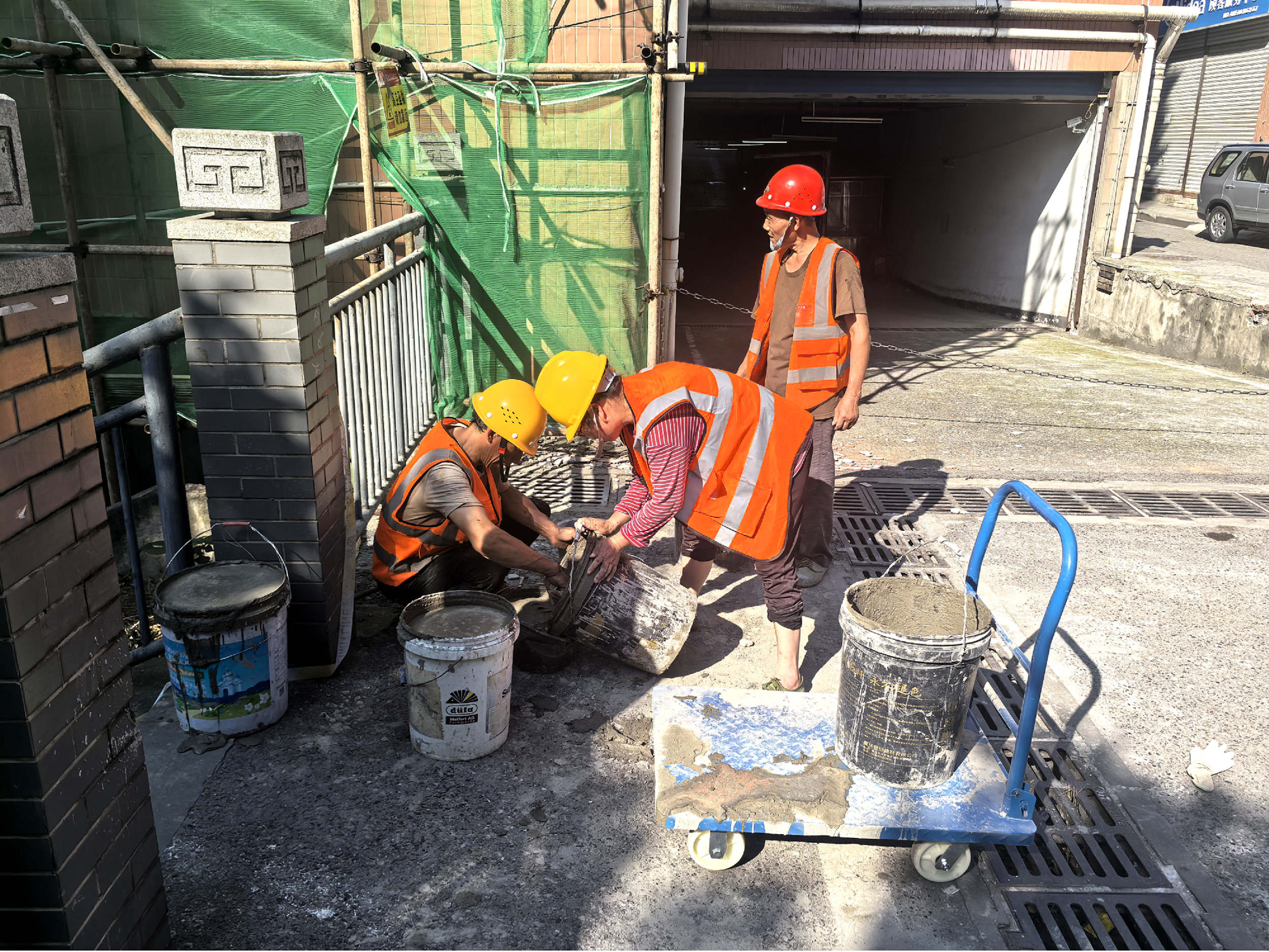 面對(duì)緊迫的任務(wù)和艱巨的挑戰(zhàn),兩江建設(shè)公司聞令而動(dòng),于5月15日迅速集結(jié)力量,成立項(xiàng)目部。一方面,迅速統(tǒng)籌調(diào)配人員與設(shè)備,精心組織進(jìn)場(chǎng)施工。施工人員嚴(yán)格按照已確認(rèn)的隱患整治方案,有條不紊地開展工作,同時(shí)做好現(xiàn)場(chǎng)安全防護(hù)措施,確保施工安全有序進(jìn)行。另一方面,在合同流程上,公司與街道緊密配合,邊施工邊完善合同簽訂工作,在保障依法依規(guī)的前提下,全力加快隱患整治進(jìn)度。同時(shí),項(xiàng)目部與街道形成強(qiáng)大的工作合力,無(wú)論是協(xié)調(diào)居民臨時(shí)出行路線,還是攻克高層外墻施工技術(shù)難關(guān),力求做到讓居民滿意、讓政府放心。