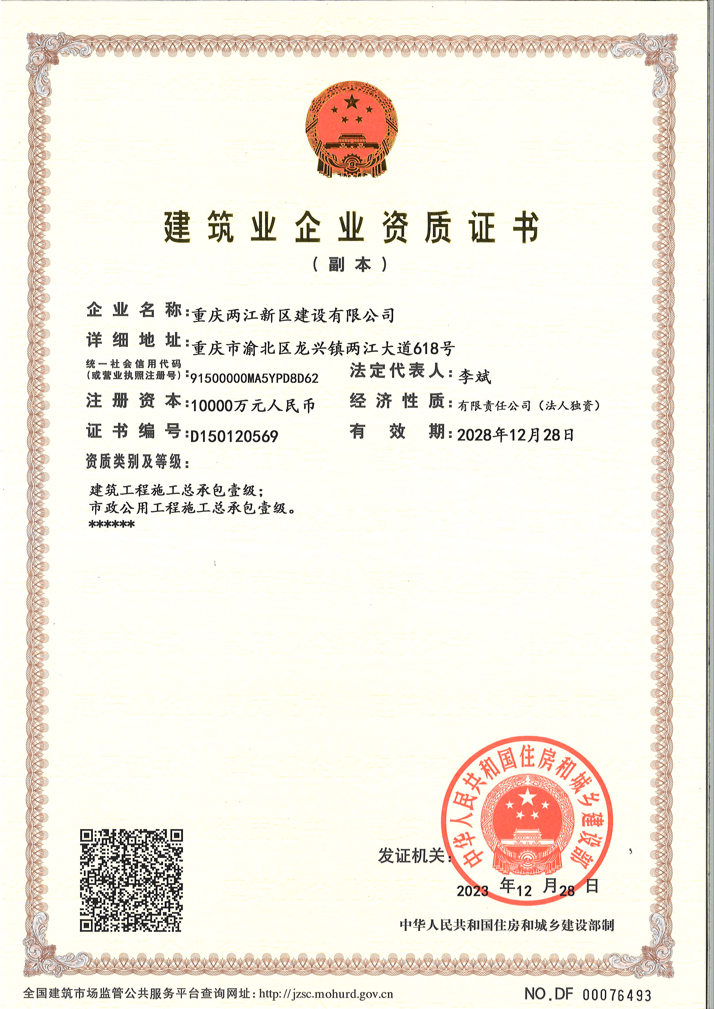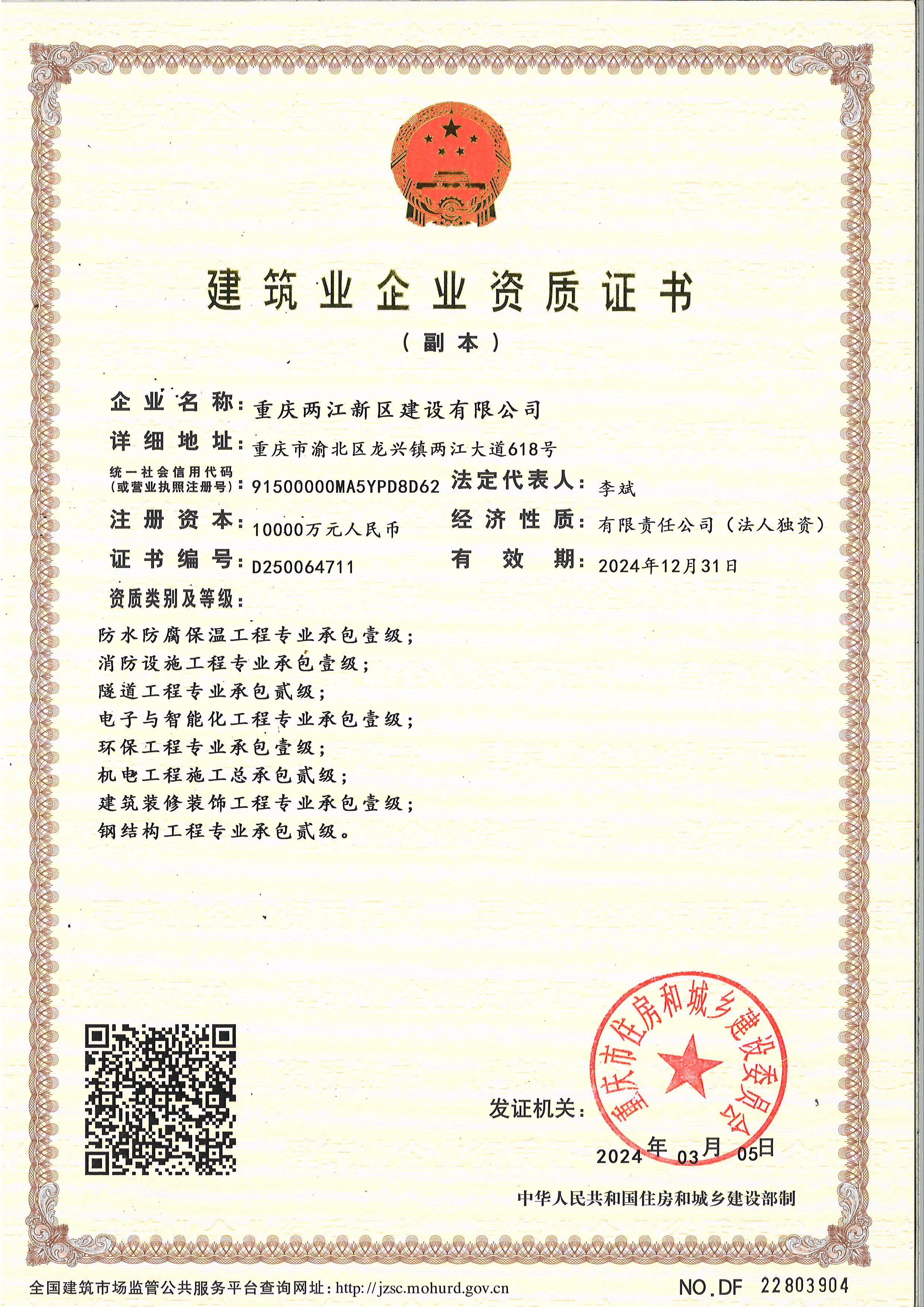 重慶兩江新區(qū)建設(shè)有限公司擁有建筑工程施工總承包壹級、市政公用工程施工總承包壹級、建筑裝修裝飾工程專業(yè)承包壹級、機(jī)電工程施工總承包貳級、防水防腐保溫工程專業(yè)承包貳級、消防設(shè)施工程專業(yè)承包貳級、鋼結(jié)構(gòu)工程專業(yè)承包貳級資質(zhì)。公司成立以來,已承接了溉瀾溪項目土石方及邊坡支護(hù)工程、溉瀾溪體育公園工程、兩江新區(qū)綠道建設(shè)工程、照母山片區(qū)園林綠化品質(zhì)提升工程、三洞橋民俗風(fēng)情街等項目的施工建設(shè)。代建了兩江新區(qū)綠道系統(tǒng)示范線工程、龍井湖生態(tài)園景觀提升工程、星光小學(xué)人行天橋工程等三十余個近30億元的項目。公司的建筑施工及代建業(yè)務(wù)正在兩江新區(qū)大地上徐徐拉開大幕。